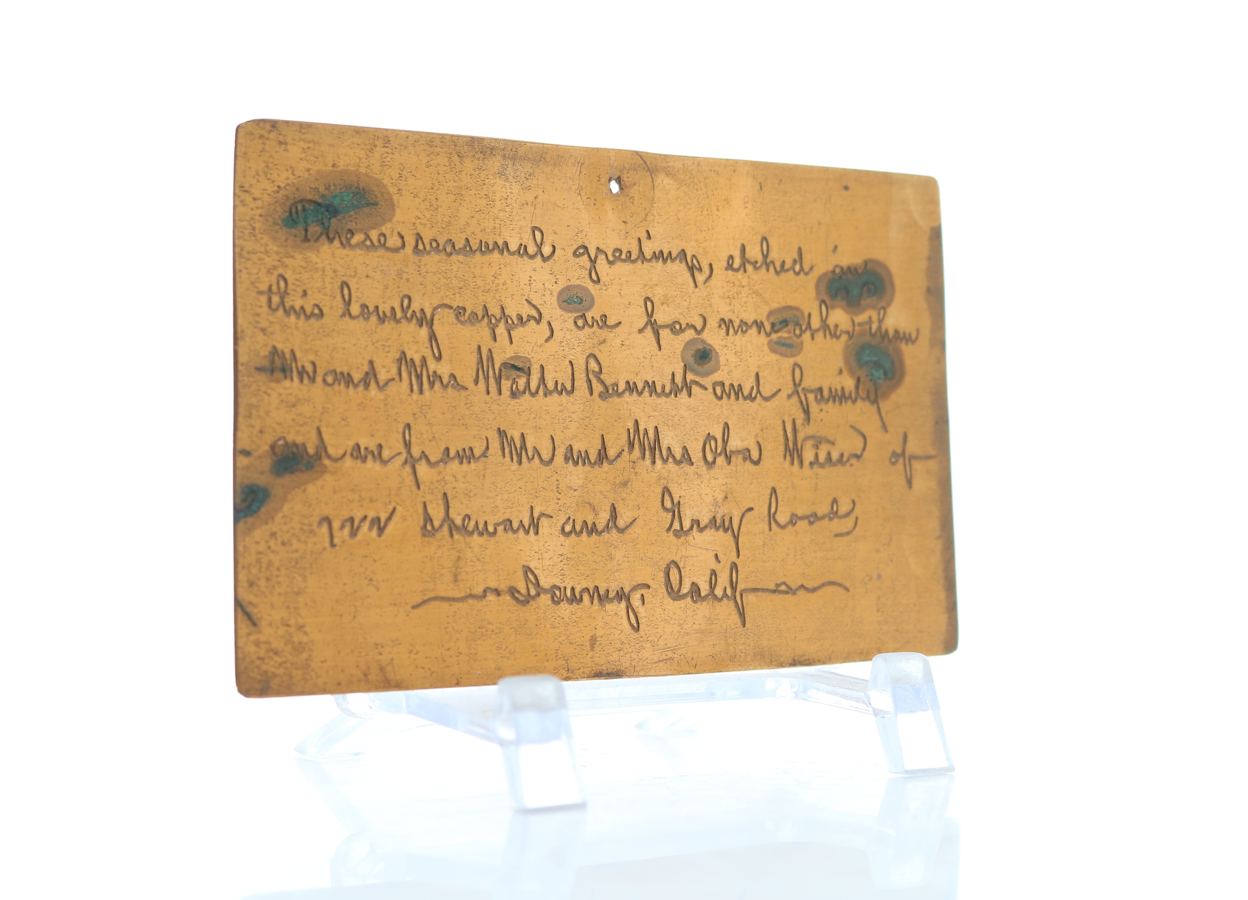 Front: These seasonal greetings, etched on this lovely copper, are for none other than Mr and Mrs Mathew Bennett and family and are from Mr and Mrs ?Ola Wisen? of 222 Stewart and Gray Road. Downey, California.