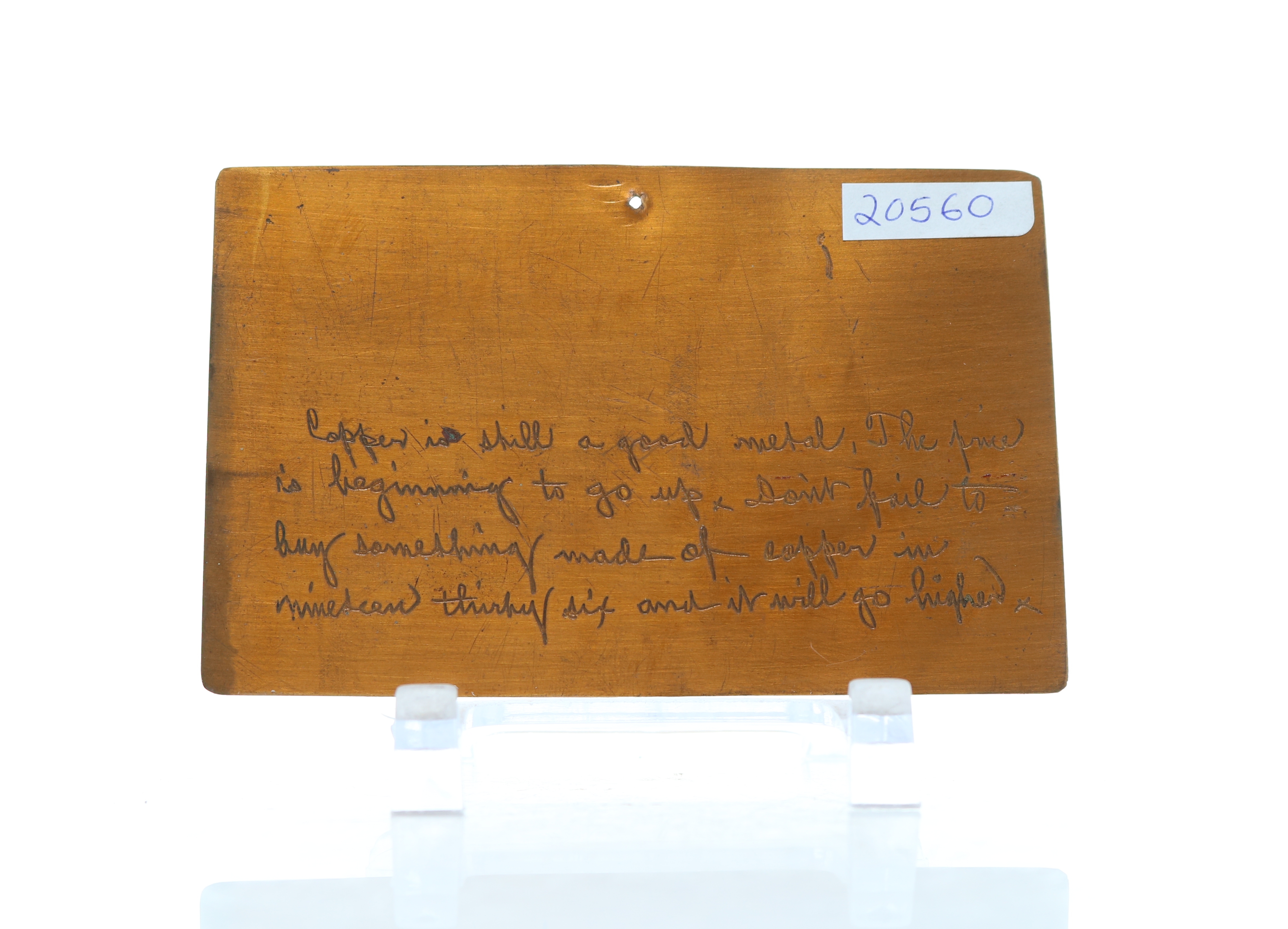 Back: Copper is still a good metal, The price is beginning to go up. Don't fail to buy something made of copper in nineteen thirty six and it will go higher.